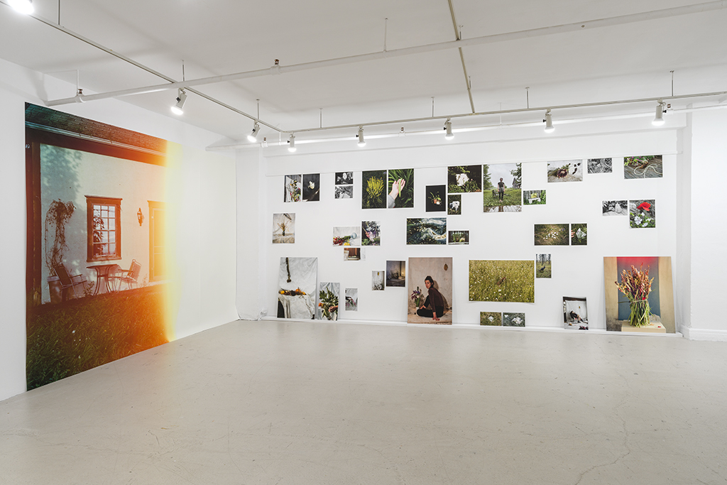 « Habiter dorénavant seule sa maison à la campagne. Le salon est vide. Il ne restera pas inoccupé. La grande bâche de coton, plus si blanche après avoir été longtemps dehors, y est maintenant accrochée. Tout près des portes vitrées, elle baigne toujours dans la lumière du jour. Par ce geste, Sara A.Tremblay se réapproprie son espace, son territoire. Elle crée une zone de travail où la vie se déroule, se met organiquement en scène, se performe. De ce lieu, elle capte son quotidien, ses plantes, ses récoltes, ses fleurs fraîches, coupées et séchées, ses animaux de compagnie, ses objets – dont un grand miroir – et même ses œuvres. Elle s’y photographie également. Les autoportraits captent le temps, attestent des évolutions, des révolutions et des expériences. C’est une façon de raconter et de vivre sa vie, de déployer sa vulnérabilité. Avec Poids, plumes, l’artiste nous permet de plonger dans son univers. Elle propose un atlas de vie reconstitué. Sur un des murs, des photos de tailles diverses sont accrochées en ordre principalement chronologique. Elles sont nombreuses. L’ensemble frappe. Il y a beaucoup de photos parce que vivre exige beaucoup. Plus qu’un geste cathartique, la photographie est une marque de présence, d’existence. Elle accompagne les jours de l’artiste. La photographie témoigne, évoque. L’approche de Sara A.Tremblay, cumulative et intuitive, est empreinte d’humanité et fait montre d’une grande humilité.