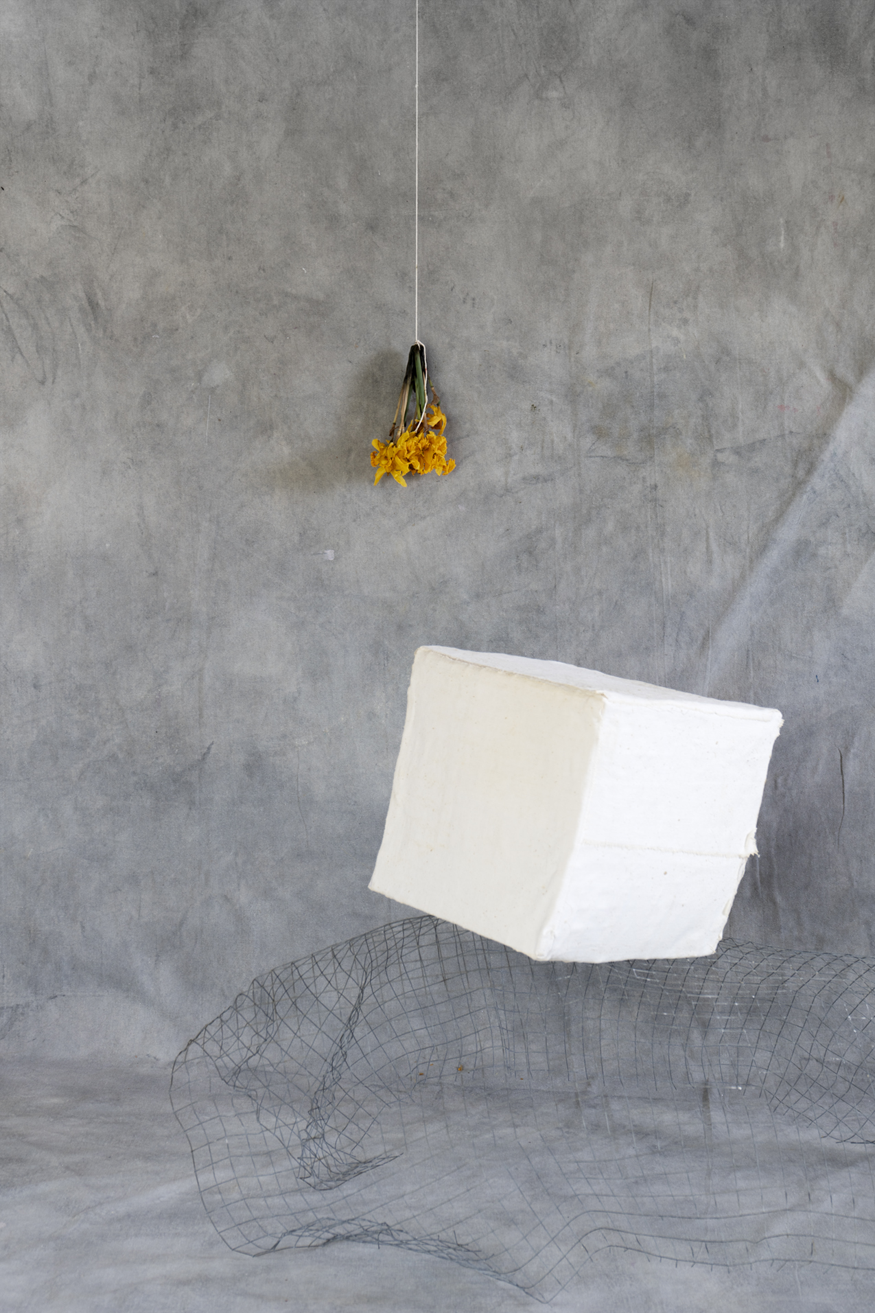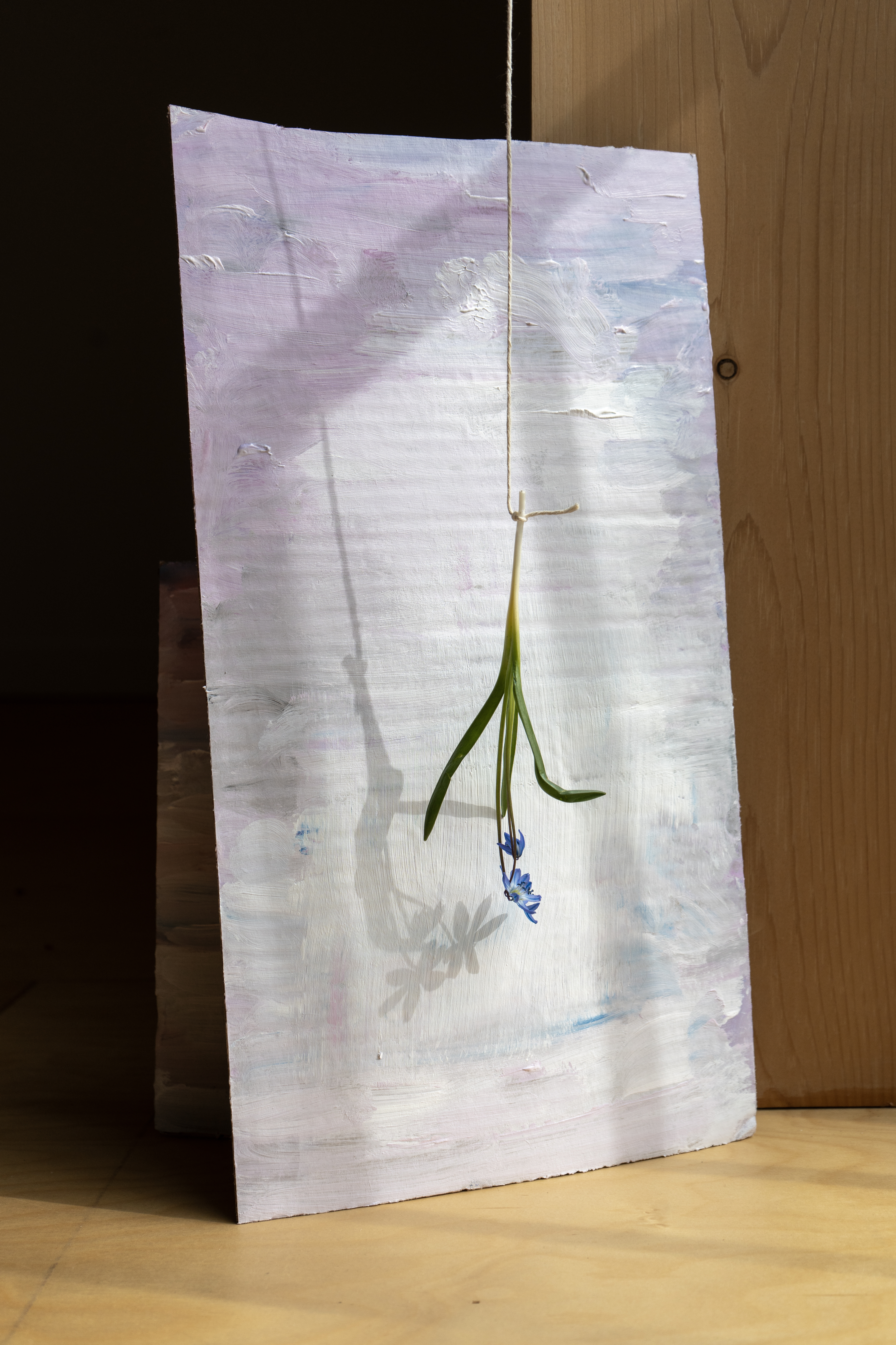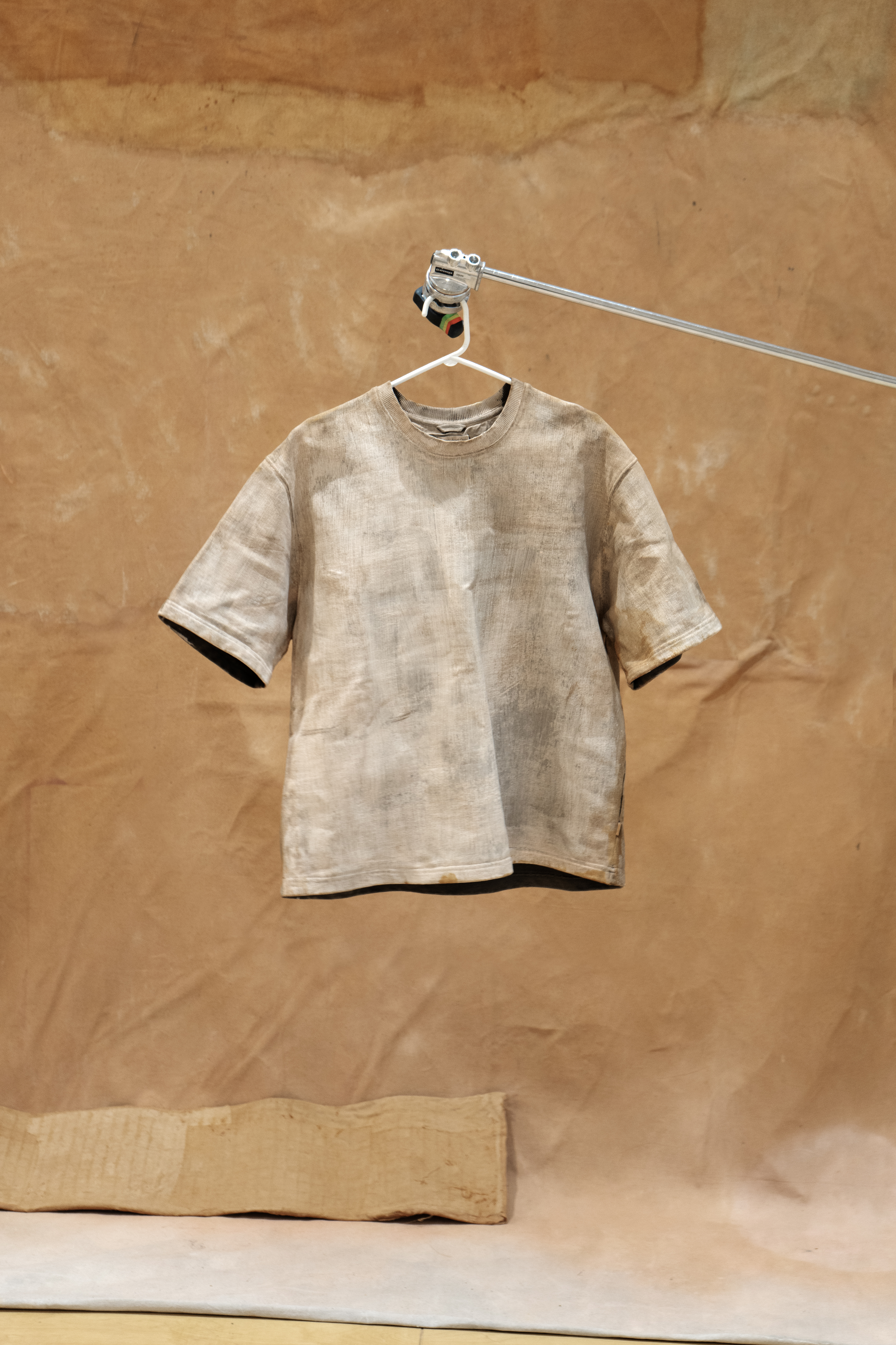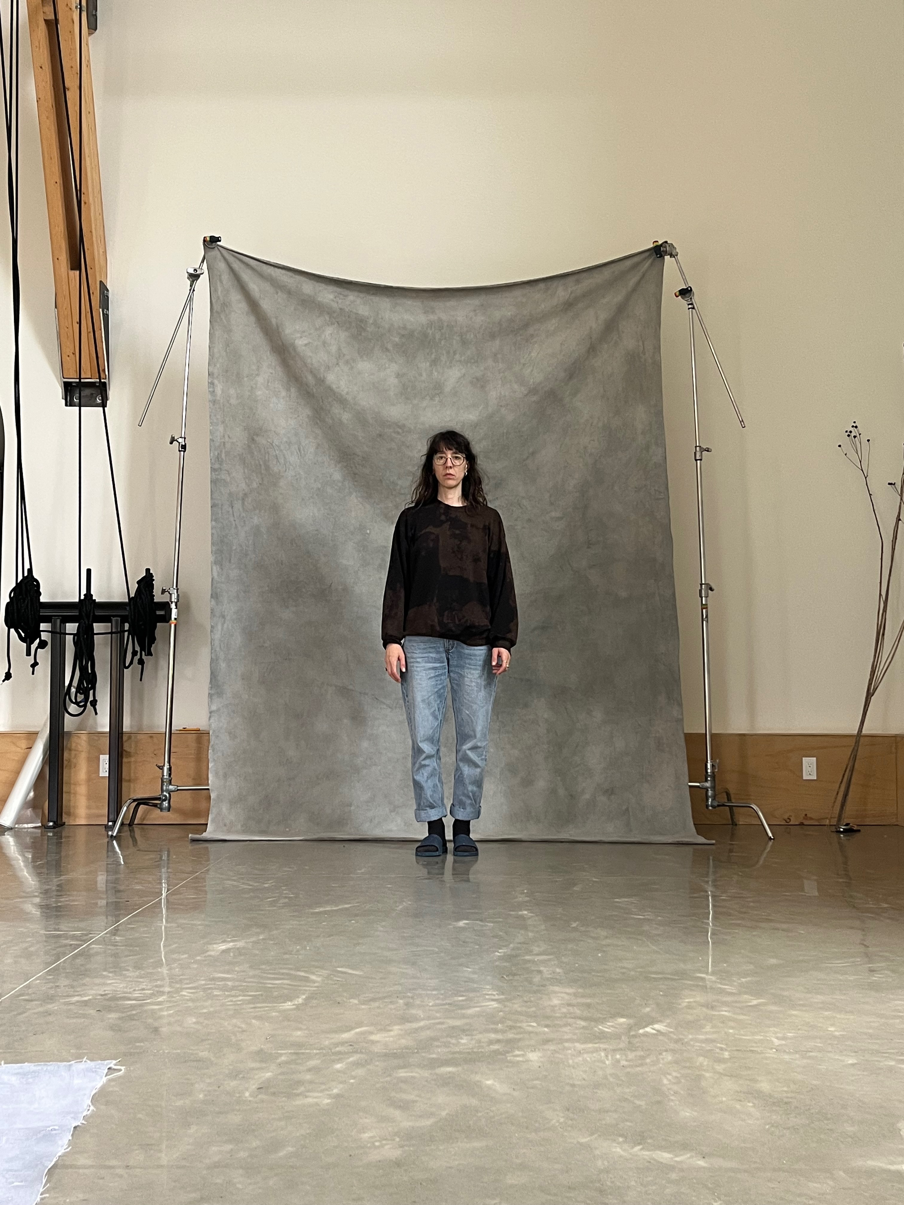 À la suite de mes expérimentations avec la grande bâche blanche du projet Tout t’empêche — usée, marquée par les éléments et transformée en surface picturale — j’ai ressenti le besoin d’approfondir cette exploration. J’ai amorcé une démarche picturale pour peindre mes propres fonds, considérant que l’arrière-plan de mes photographies occupe désormais un rôle central. Tout comme les objets ou les corps, ces fonds possèdent une agentivité propre dans la composition et devant la caméra. Ils ne servent plus seulement de décor, mais deviennent des éléments actifs, influençant la narration visuelle et participant pleinement à l’œuvre.