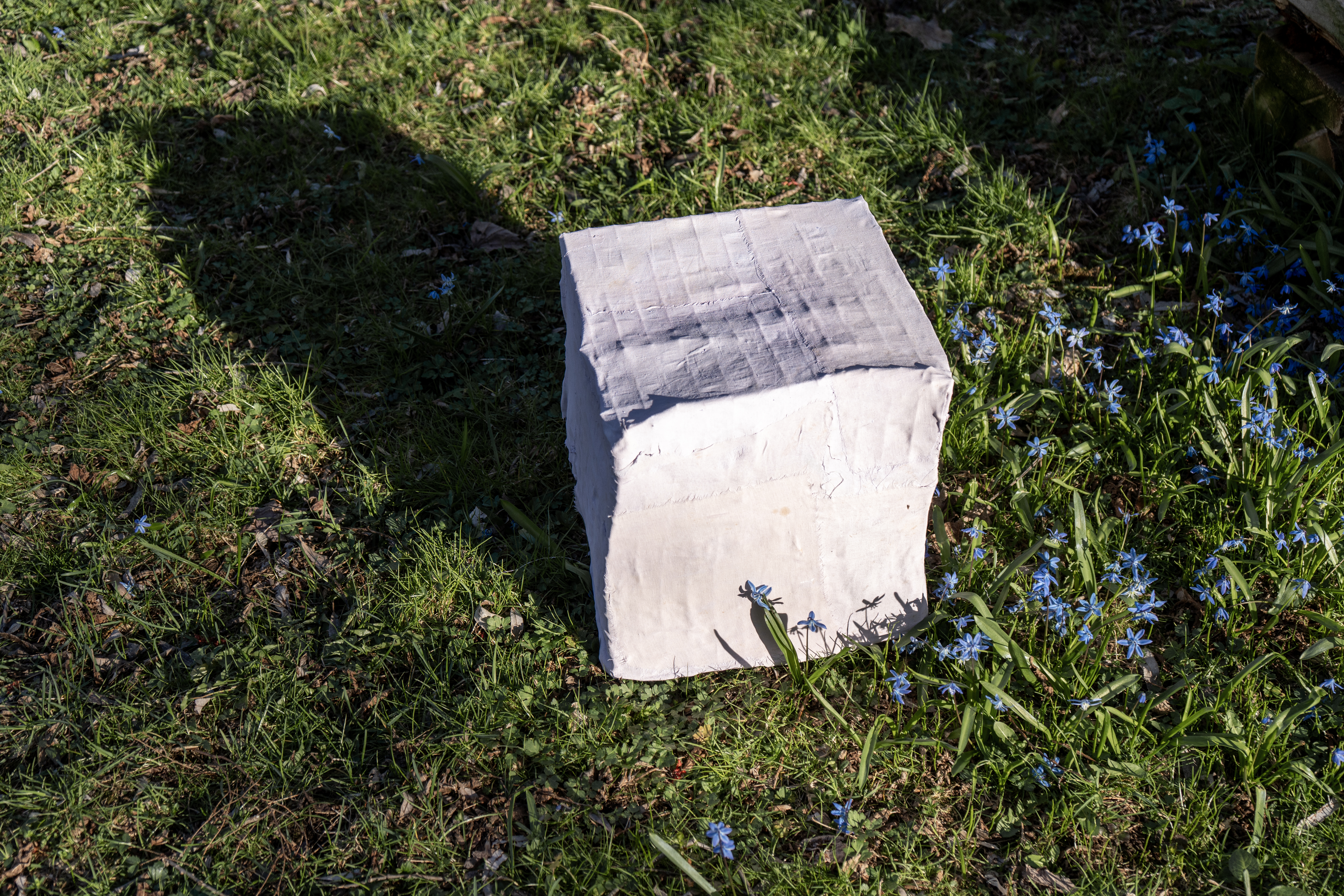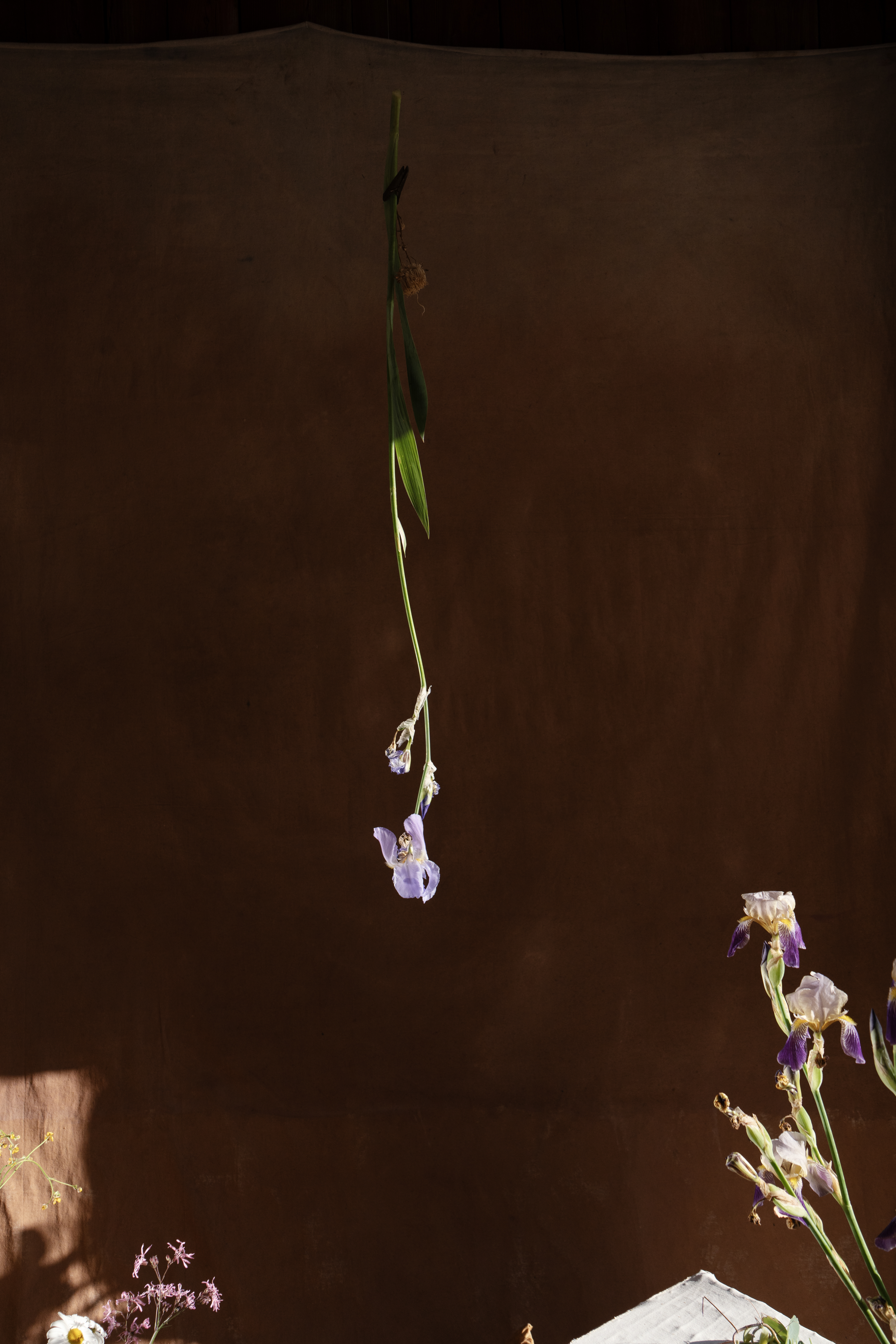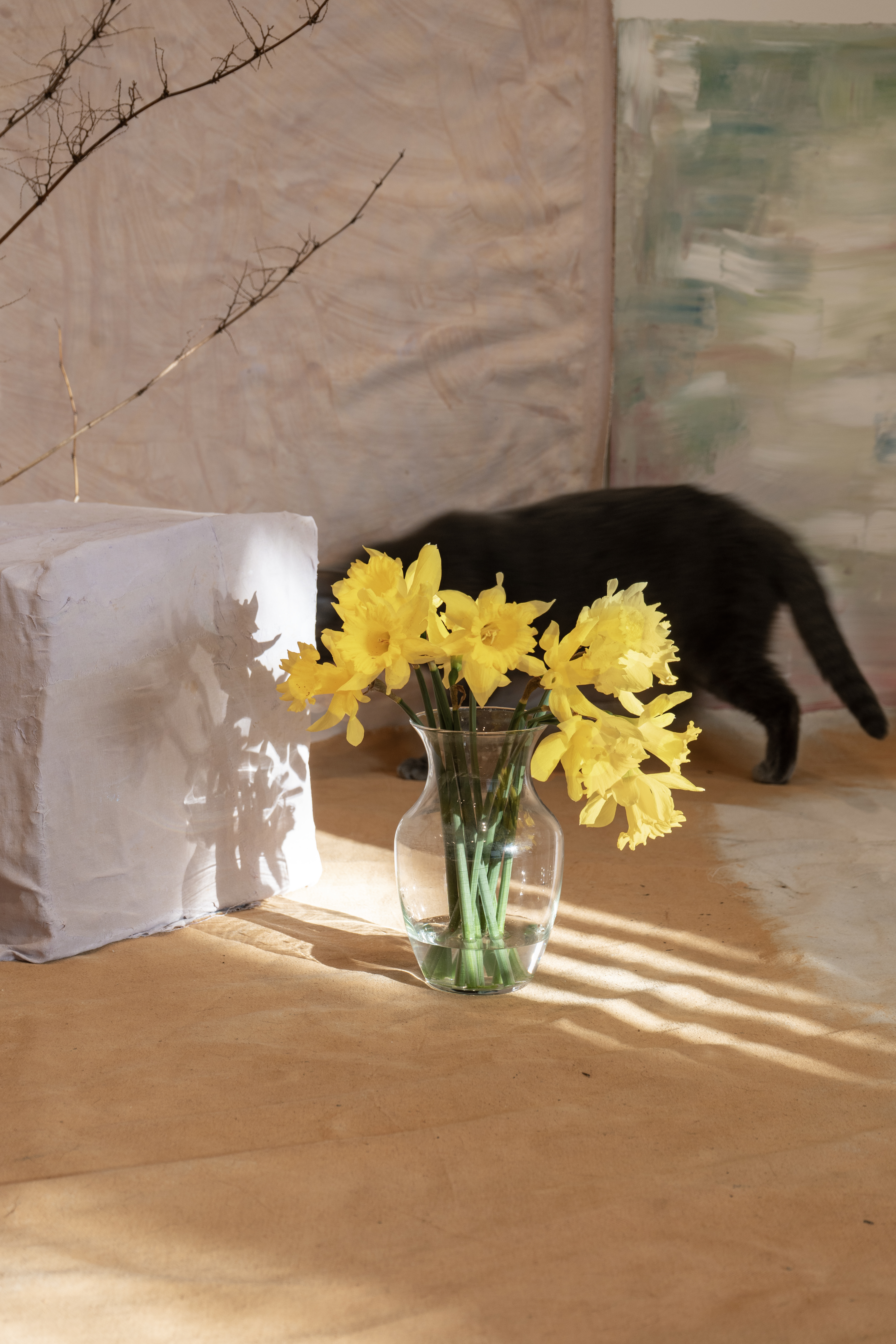 À la suite de mes expérimentations avec la grande bâche blanche du projet Tout t’empêche — usée, marquée par les éléments et transformée en surface picturale — j’ai ressenti le besoin d’approfondir cette exploration. J’ai amorcé une démarche picturale pour peindre mes propres fonds, considérant que l’arrière-plan de mes photographies occupe désormais un rôle central. Tout comme les objets ou les corps, ces fonds possèdent une agentivité propre dans la composition et devant la caméra. Ils ne servent plus seulement de décor, mais deviennent des éléments actifs, influençant la narration visuelle et participant pleinement à l’œuvre.