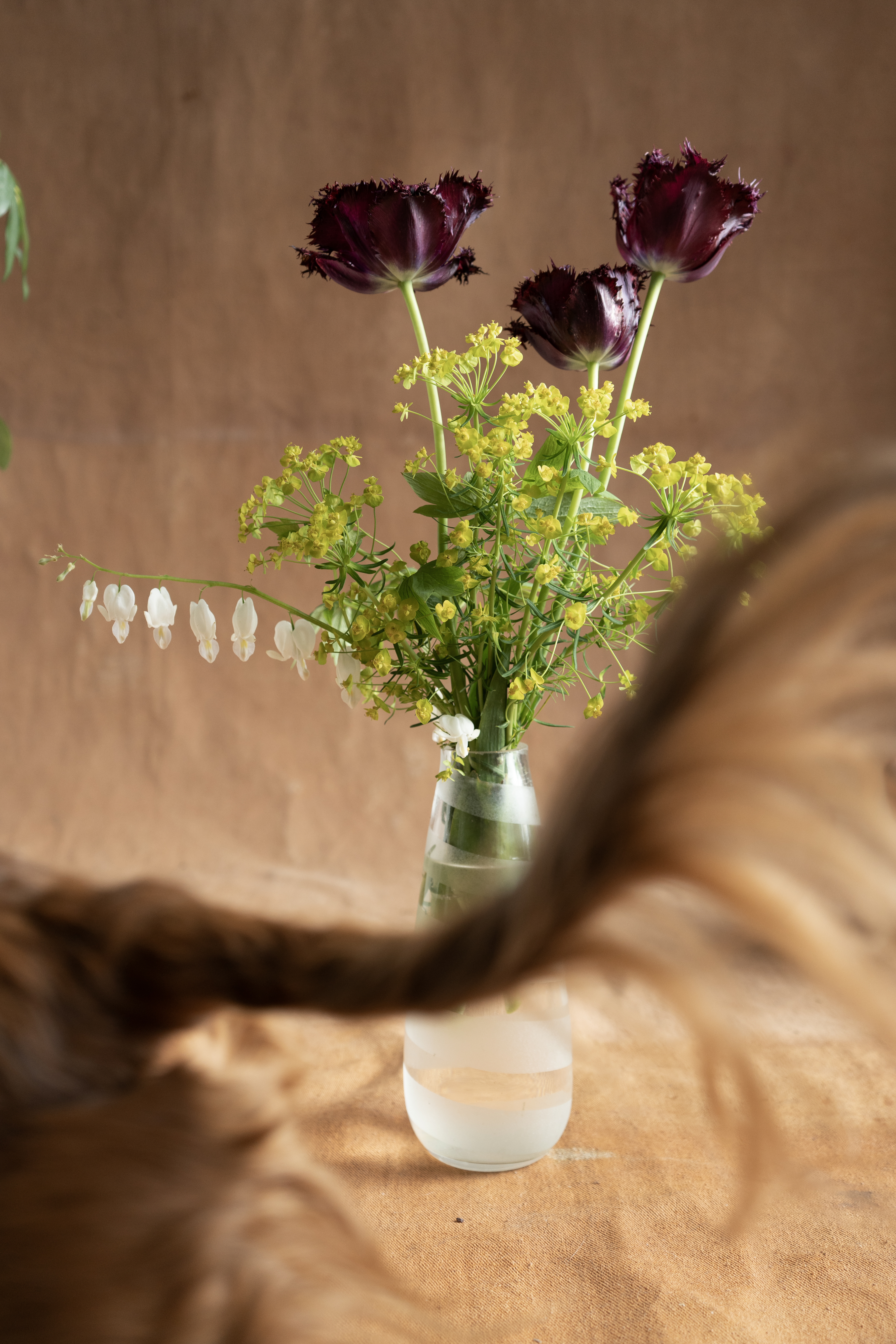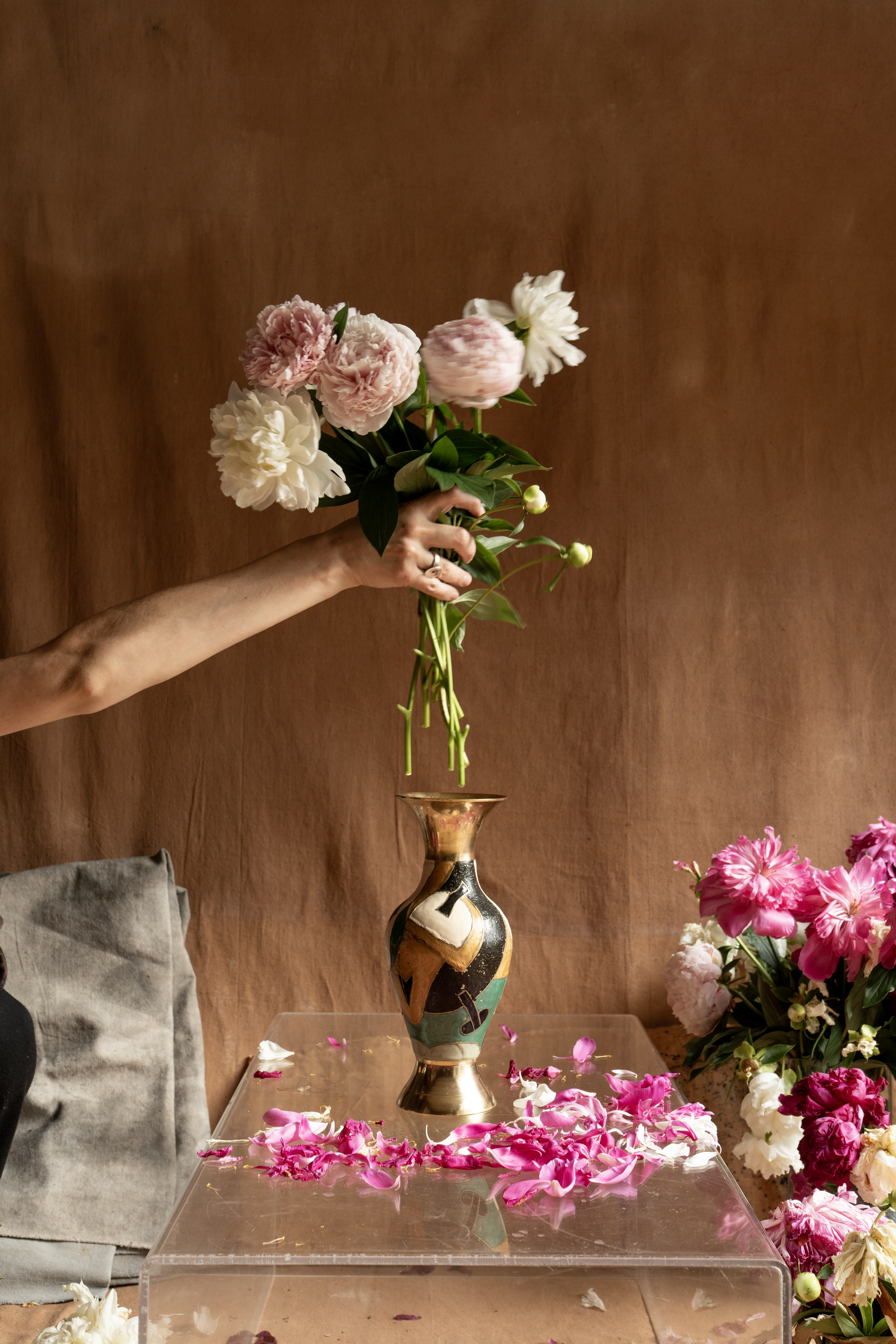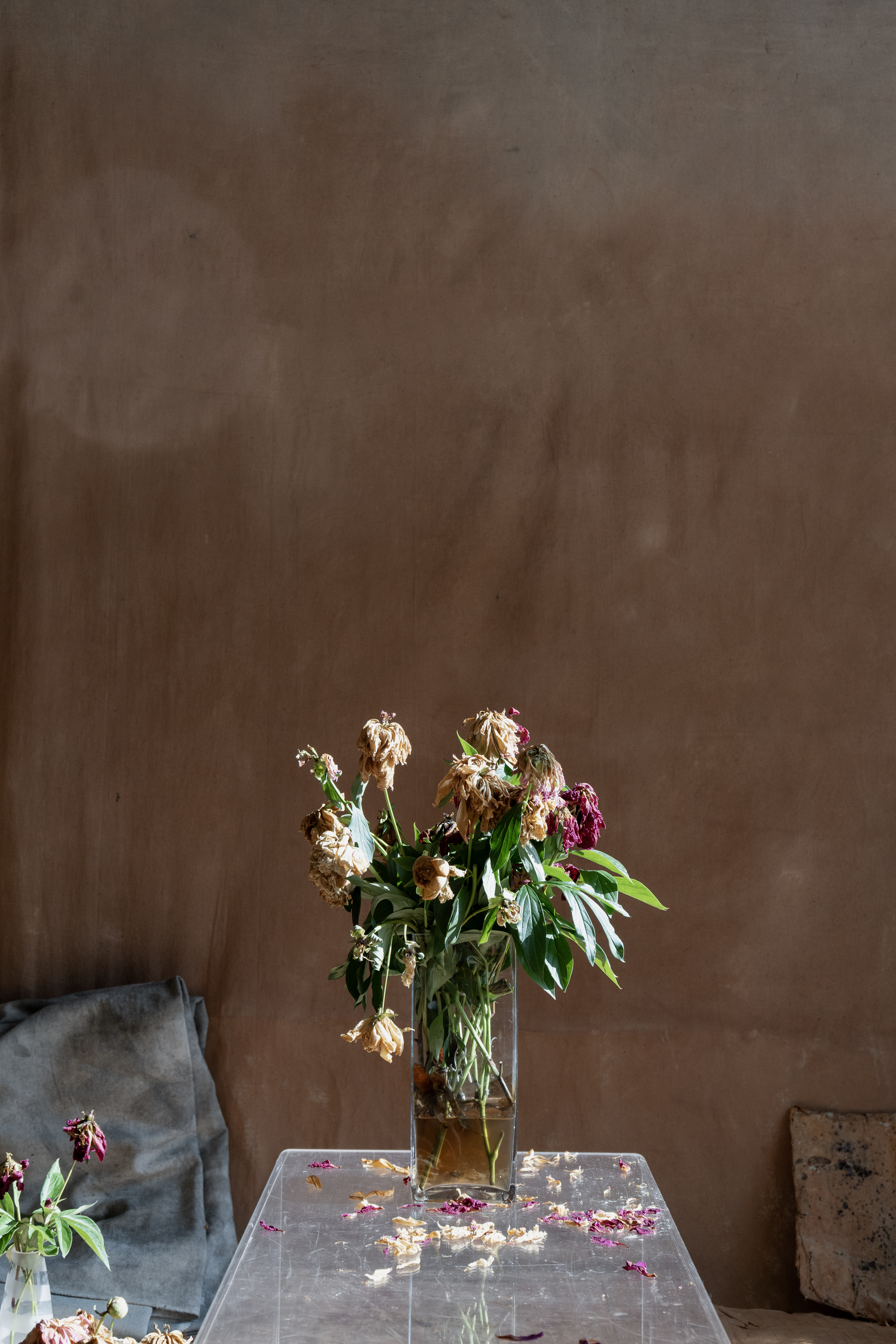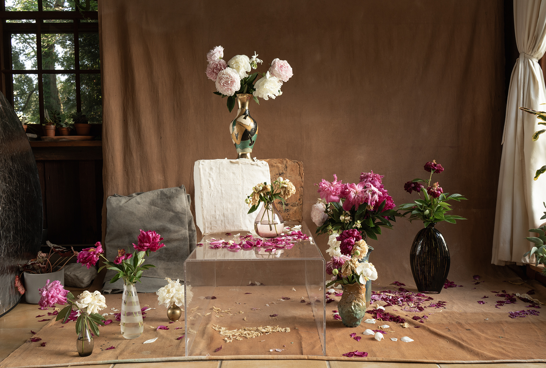 À la suite de mes expérimentations avec la grande bâche blanche du projet Tout t’empêche — usée, marquée par les éléments et transformée en surface picturale — j’ai ressenti le besoin d’approfondir cette exploration. J’ai amorcé une démarche picturale pour peindre mes propres fonds, considérant que l’arrière-plan de mes photographies occupe désormais un rôle central. Tout comme les objets ou les corps, ces fonds possèdent une agentivité propre dans la composition et devant la caméra. Ils ne servent plus seulement de décor, mais deviennent des éléments actifs, influençant la narration visuelle et participant pleinement à l’œuvre.